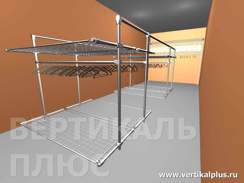 Вы можете купить гардеробное оборудование различной степени функциональности, представленная модель гардеробного оборудования(тип 22) оснащена стальнымихромированными сетками-полками для головных уборов и обуви. Это функционально и в тоже самое время выглядит современно. Модель гардеробного оборудования, которая отлично подходит для магазинов одежды.